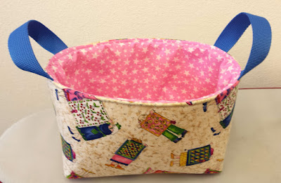 Mit dem Aussenstoff, auf dem Quilterinnen mit ihren Werken abgebildet sind, ist doch ganz klar, dass dieses farbenfrohe Körbchen im Nähzimmer zum Einsatz kommt.